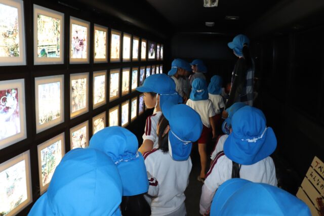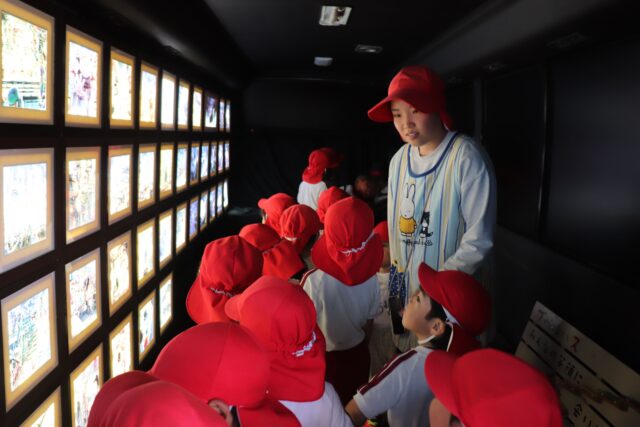 バスの車内のきれいな絵にうっとりな子ども達