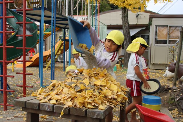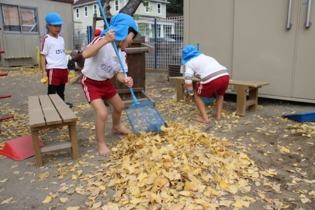 イチョウの葉をみんなで集めるよ