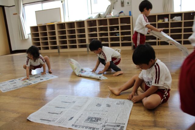 子ども達なりに新聞紙をクルクル巻いて棒を作ったよ