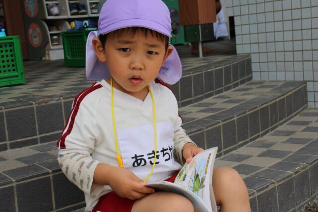 図鑑を持って春の虫を探しているよ