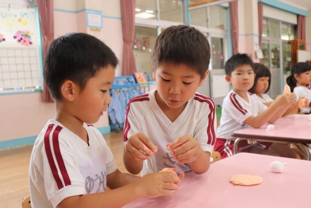 | きく組さんも紙ねんどをこねて、色を混ぜていきます | ||